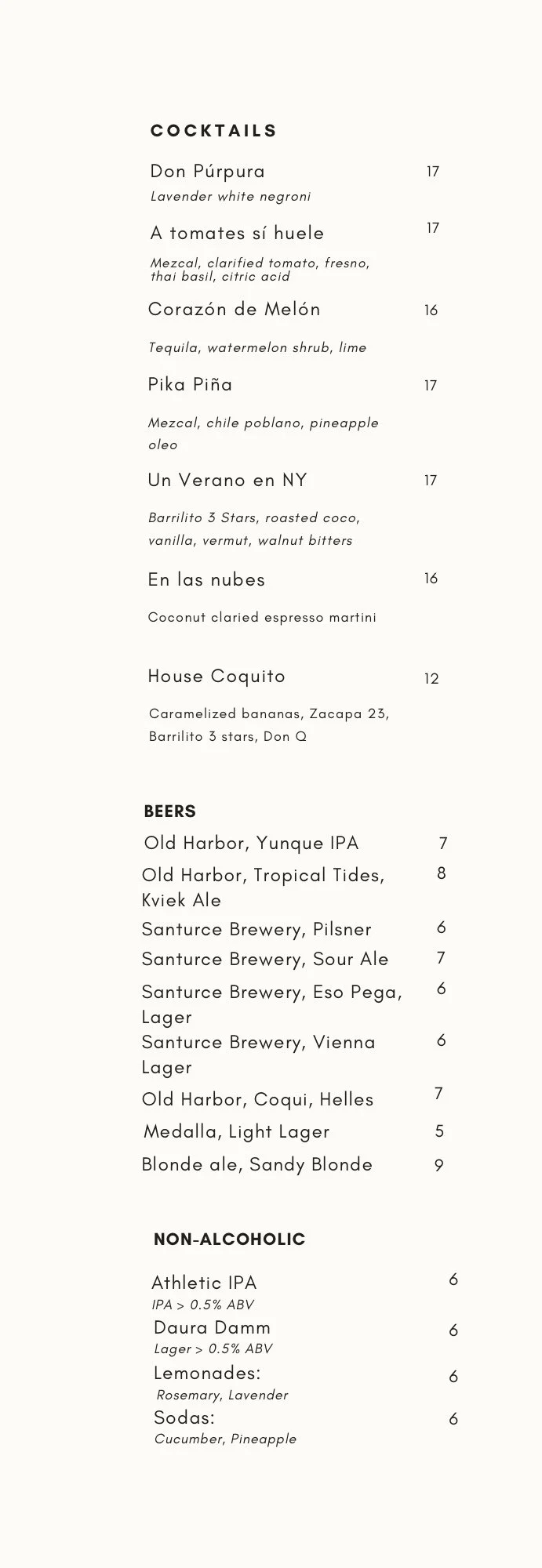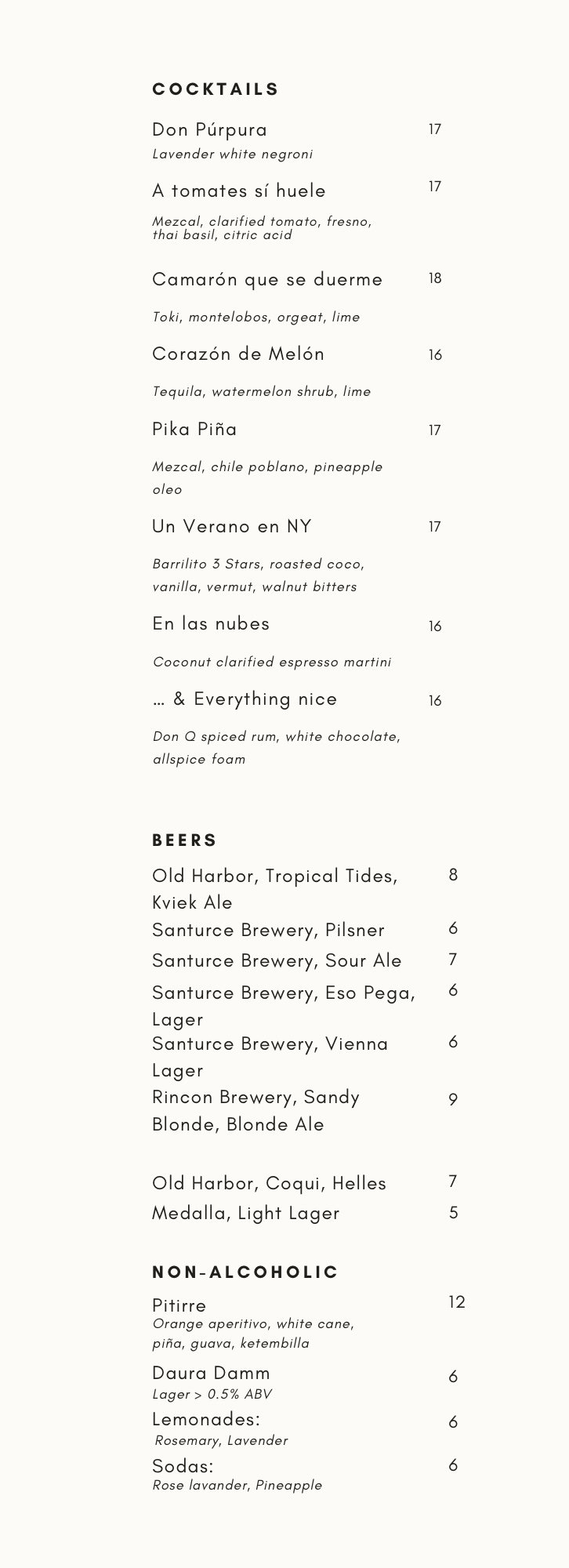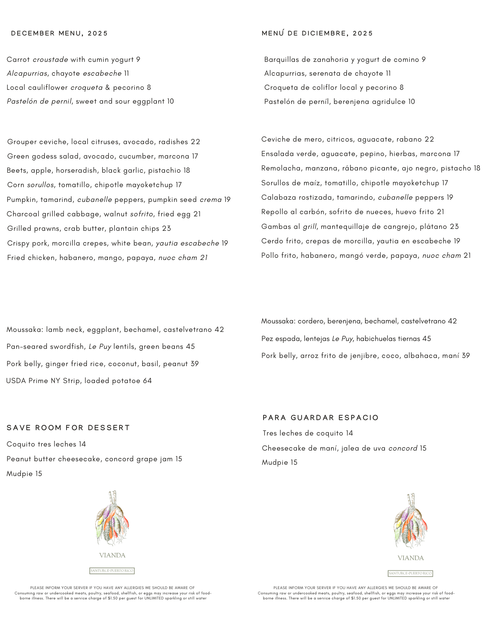 In 2017 they moved to San Juan, Chef Guzmán's hometown, to start building their first restaurant: Vianda. The Spanish language adopted the word "vianda" from the latin word “vivanda,” which means a place of living. Vianda serves a small, constantly evolving, farm-to-table menu anchored by local ingredients and products. This enables us to create, fresh, delicious food focusing on the best that Puerto Rico has to offer: its agriculture and its warm hospitality.
