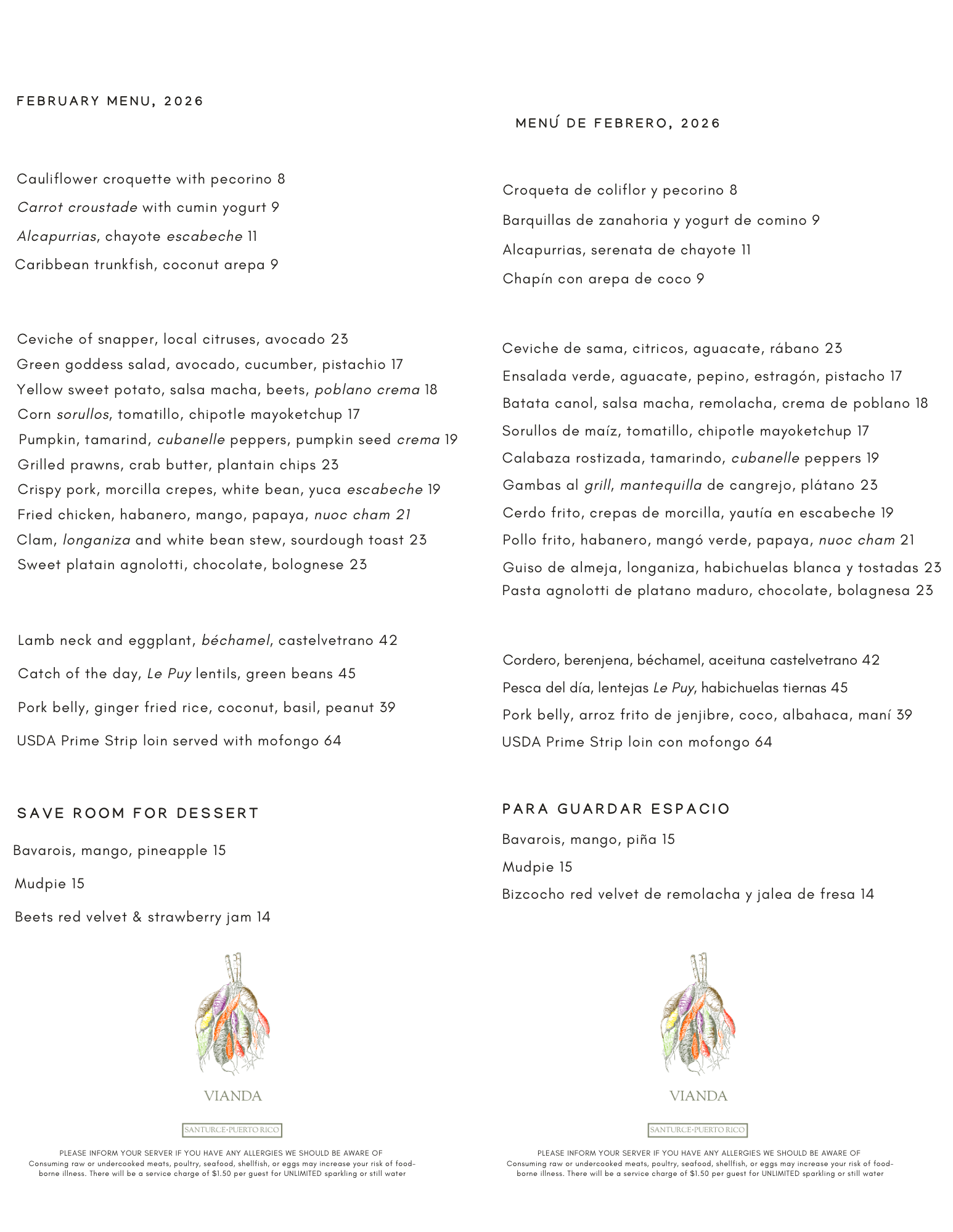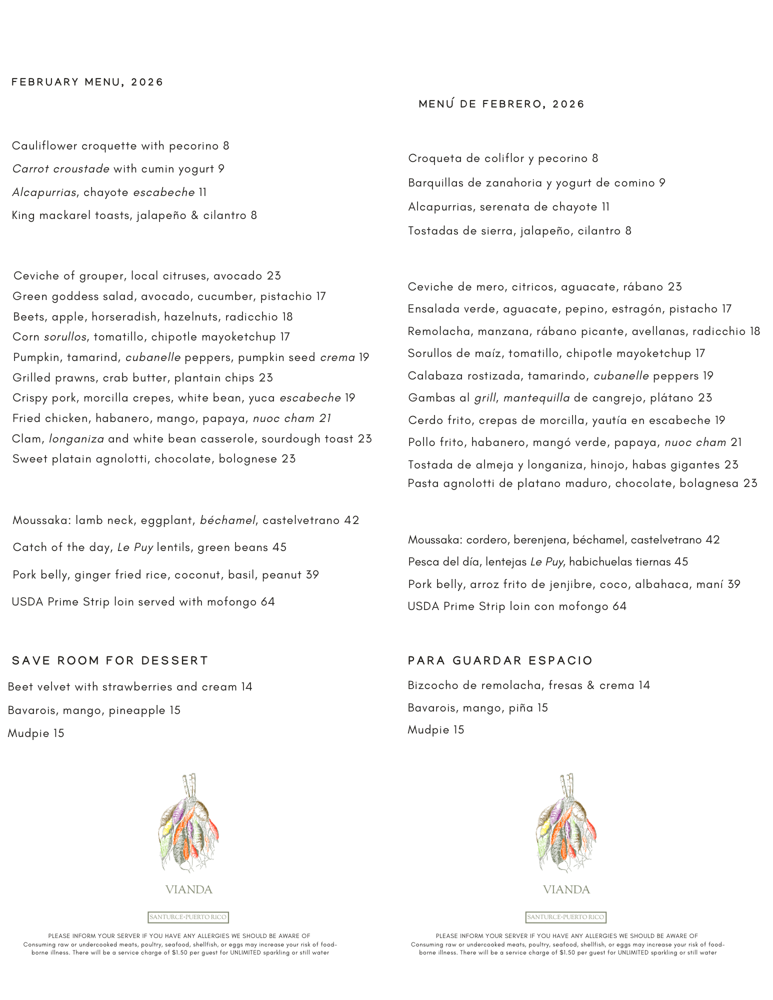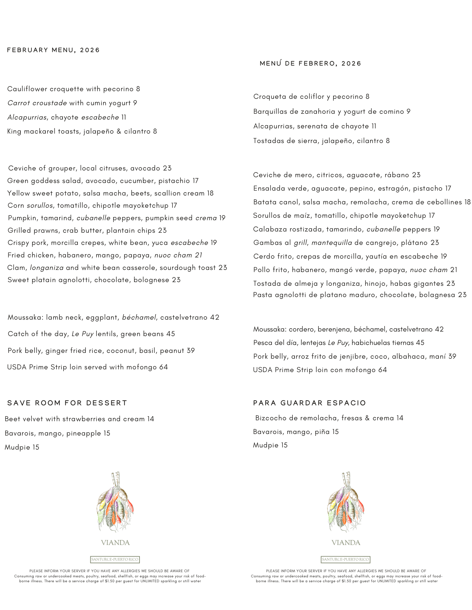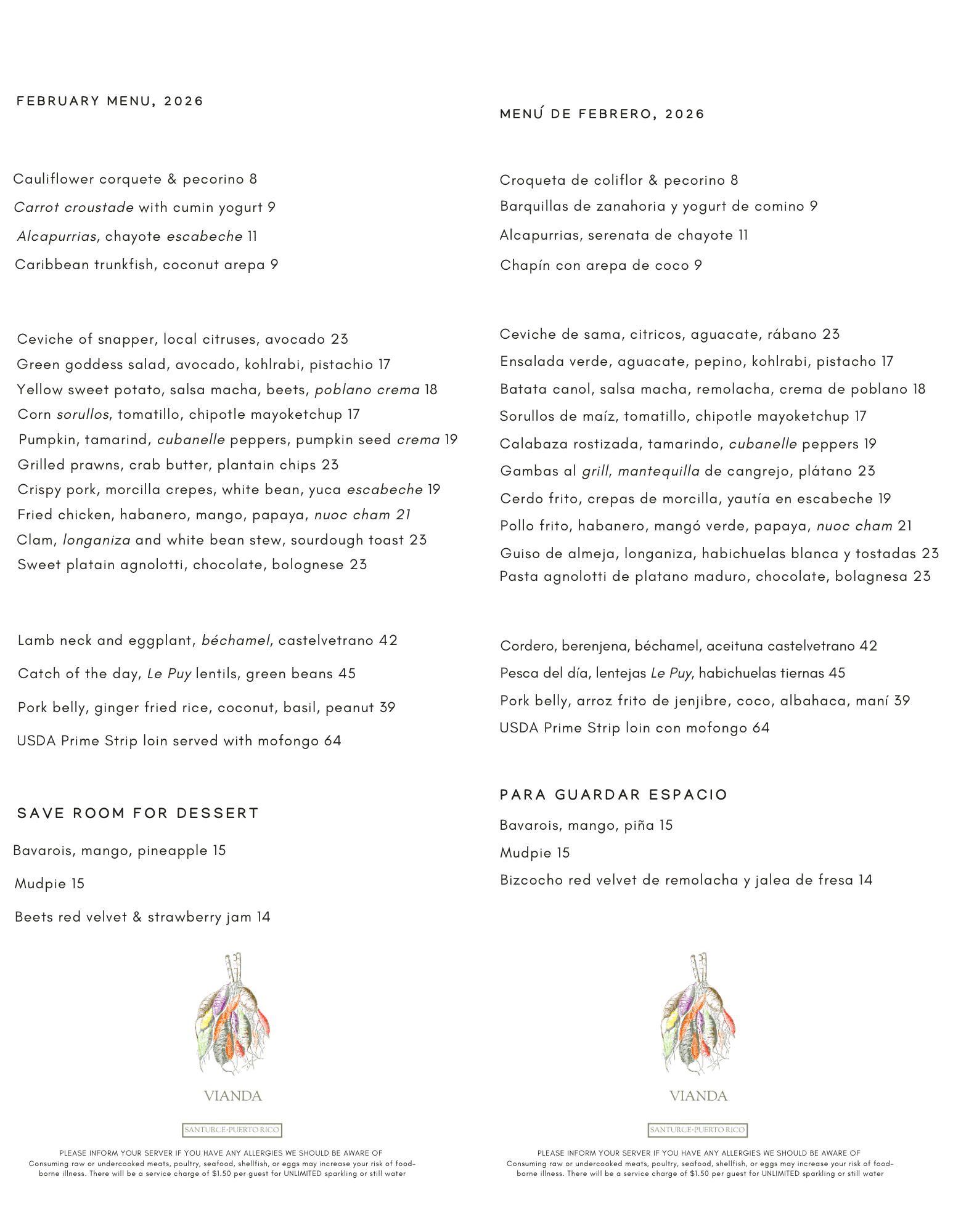 In 2017 they moved to San Juan, Chef Guzmán's hometown, to start building their first restaurant: Vianda. The Spanish language adopted the word "vianda" from the latin word “vivanda,” which means a place of living. Vianda serves a small, constantly evolving, farm-to-table menu anchored by local ingredients and products. This enables us to create, fresh, delicious food focusing on the best that Puerto Rico has to offer: its agriculture and its warm hospitality.