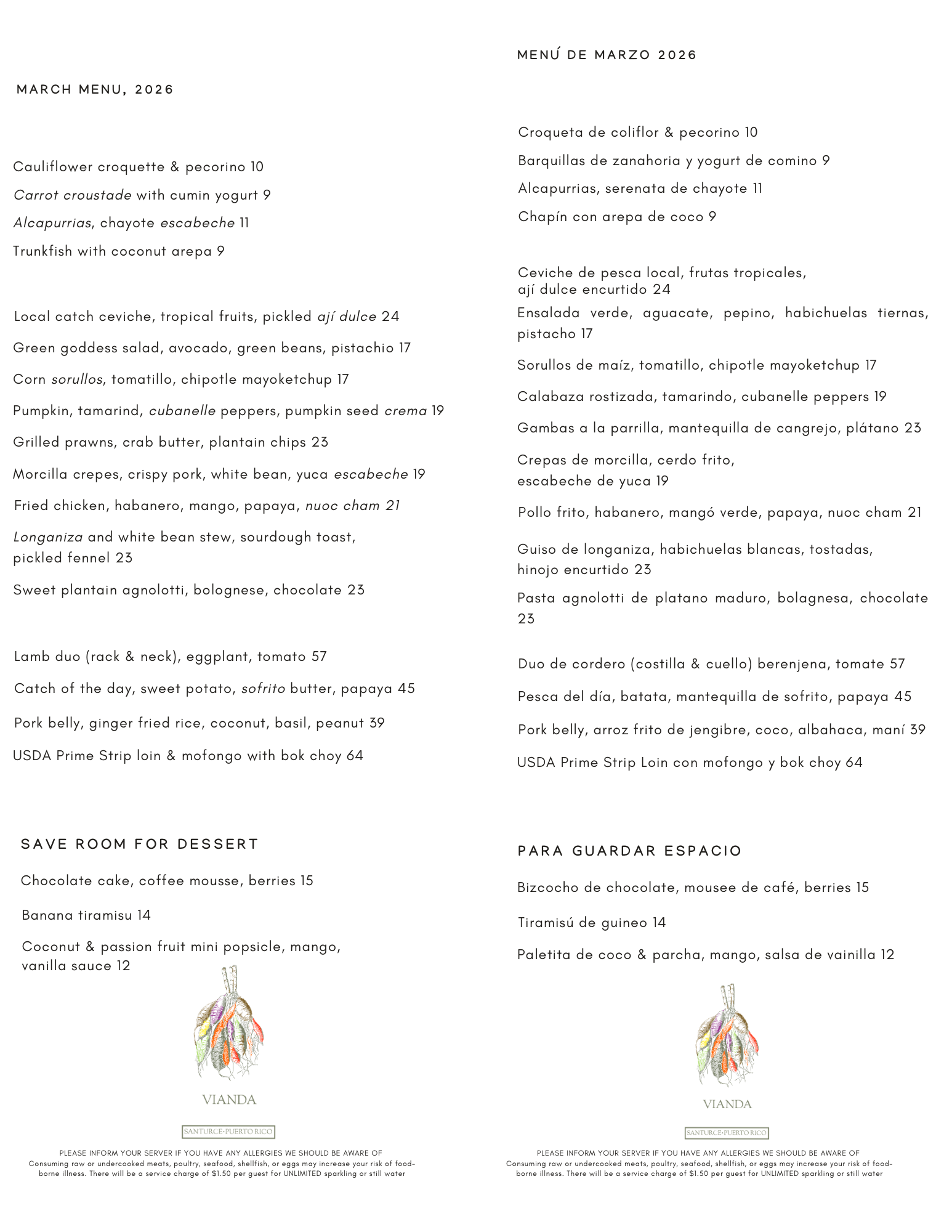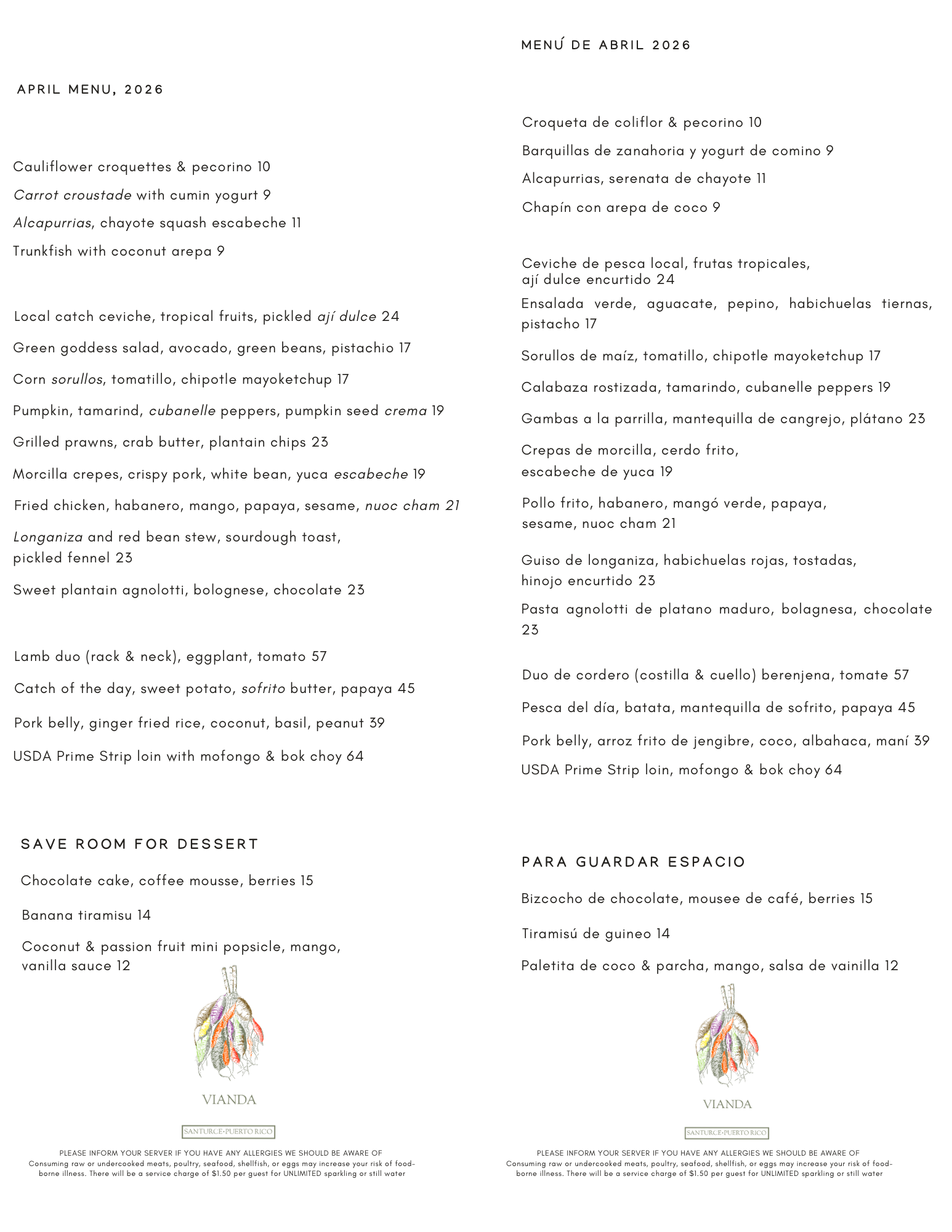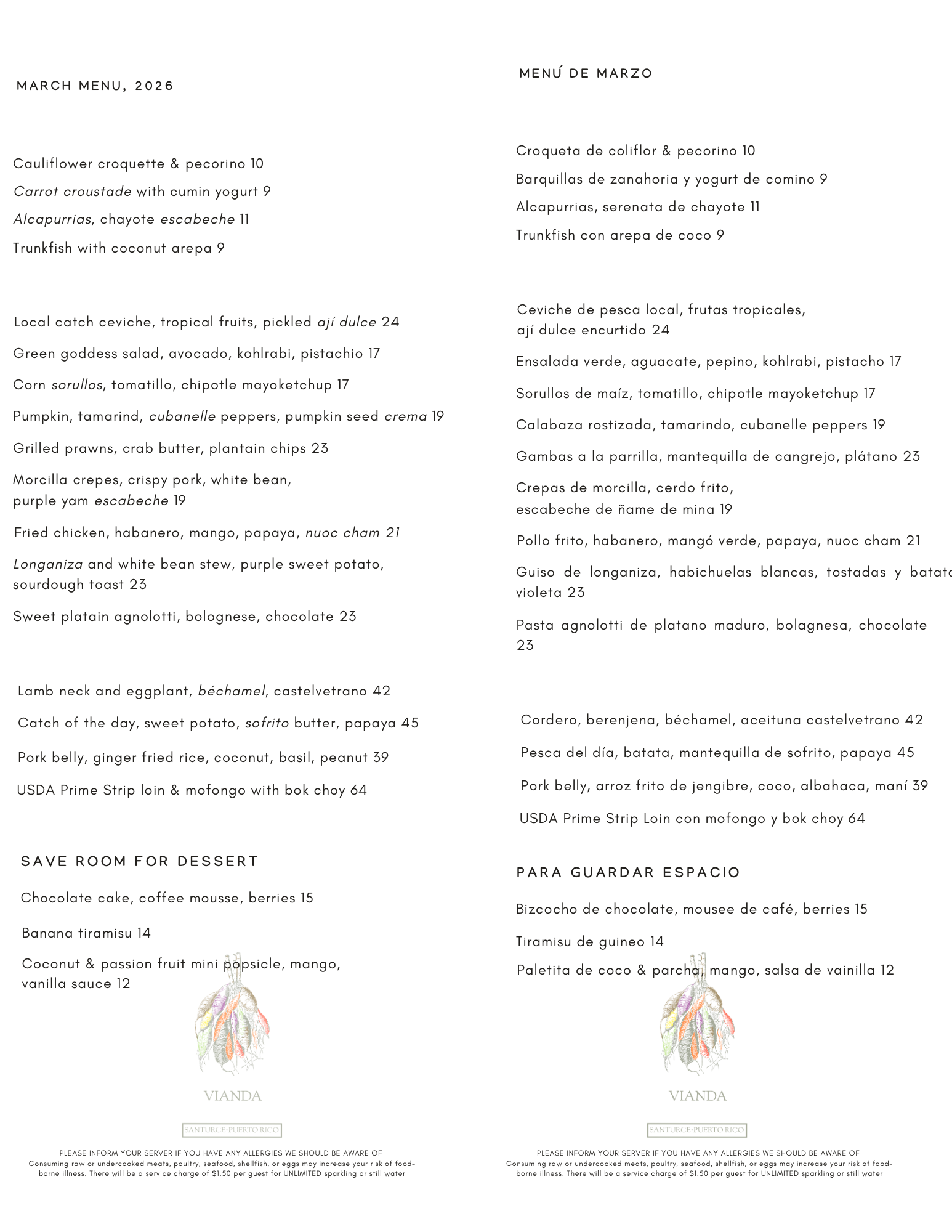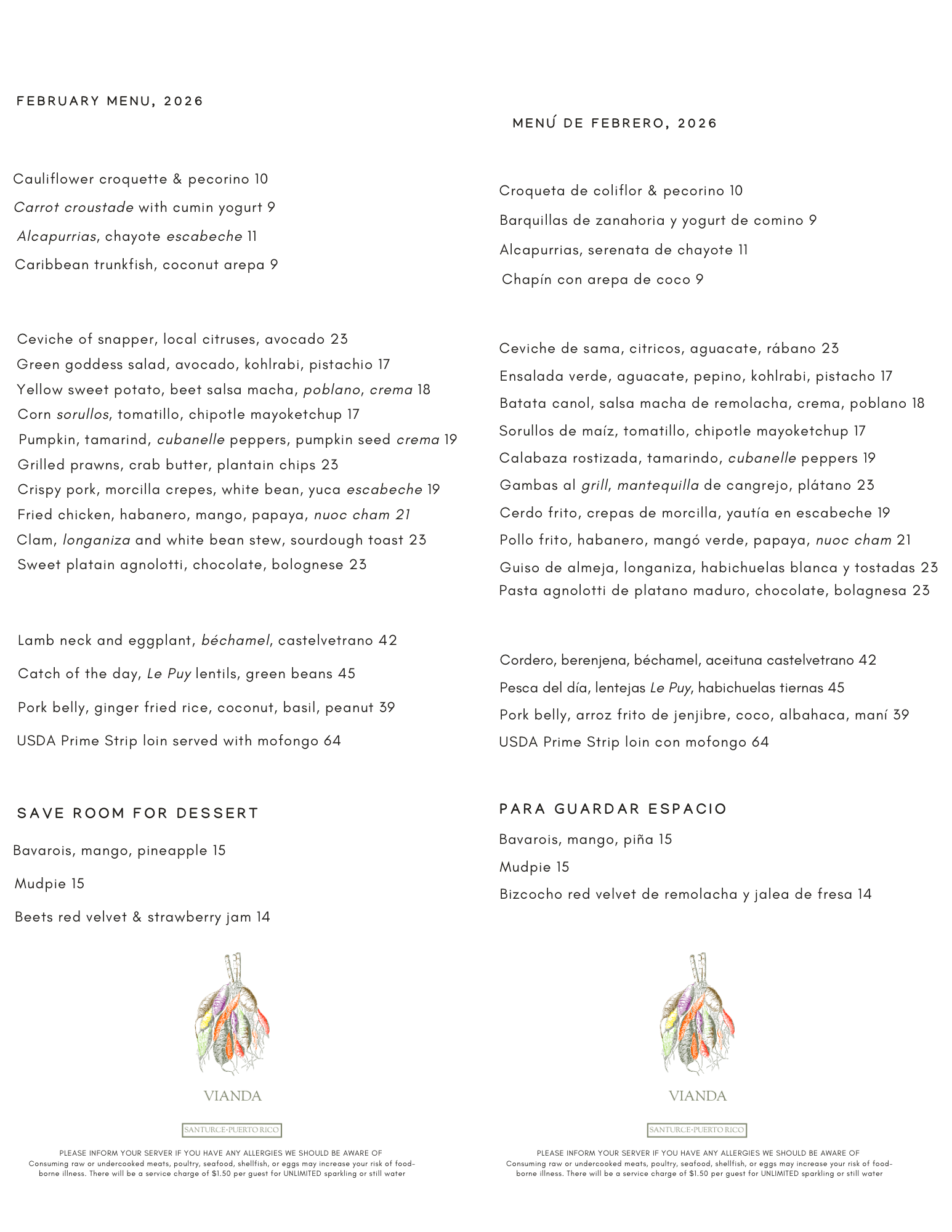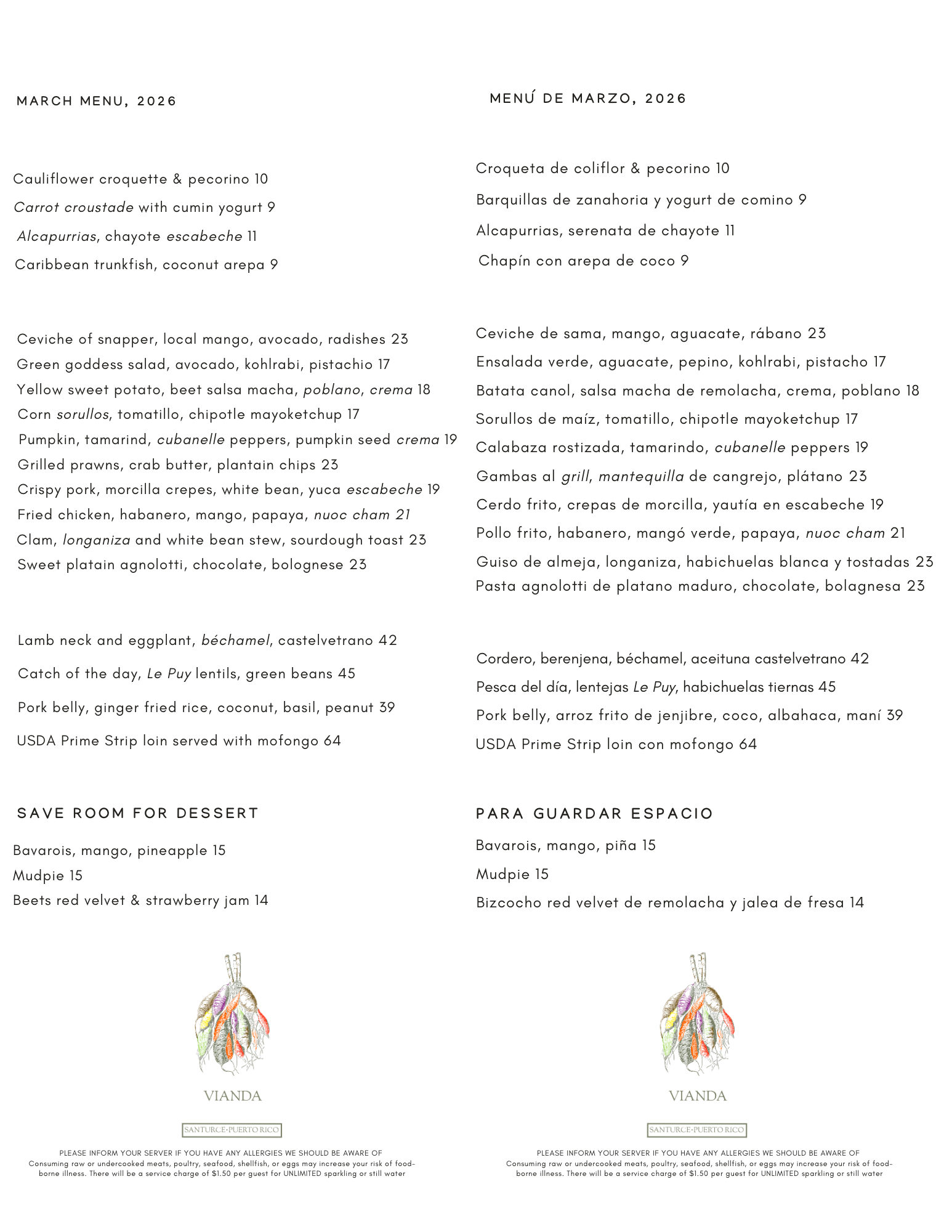 In 2017 they moved to San Juan, Chef Guzmán's hometown, to start building their first restaurant: Vianda. The Spanish language adopted the word "vianda" from the latin word “vivanda,” which means a place of living. Vianda serves a small, constantly evolving, farm-to-table menu anchored by local ingredients and products. This enables us to create, fresh, delicious food focusing on the best that Puerto Rico has to offer: its agriculture and its warm hospitality.