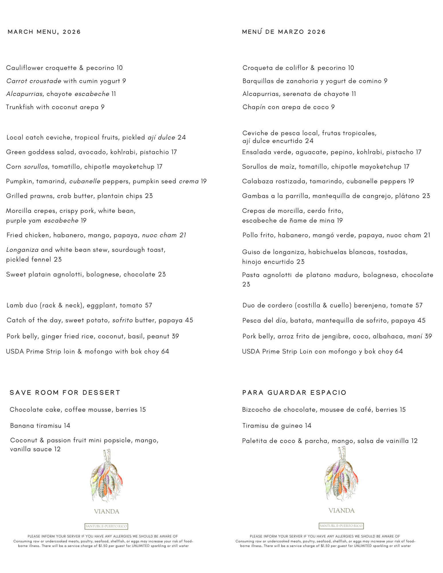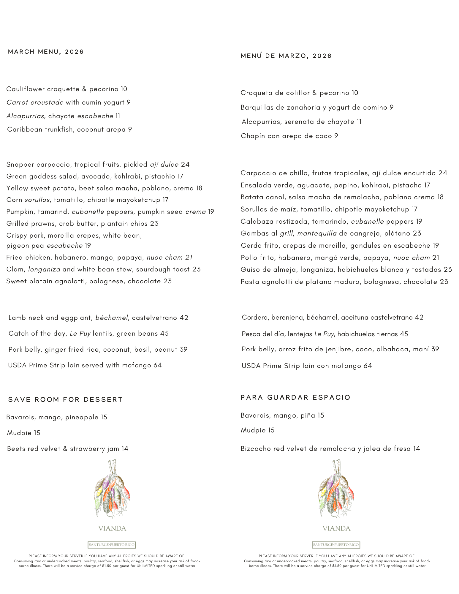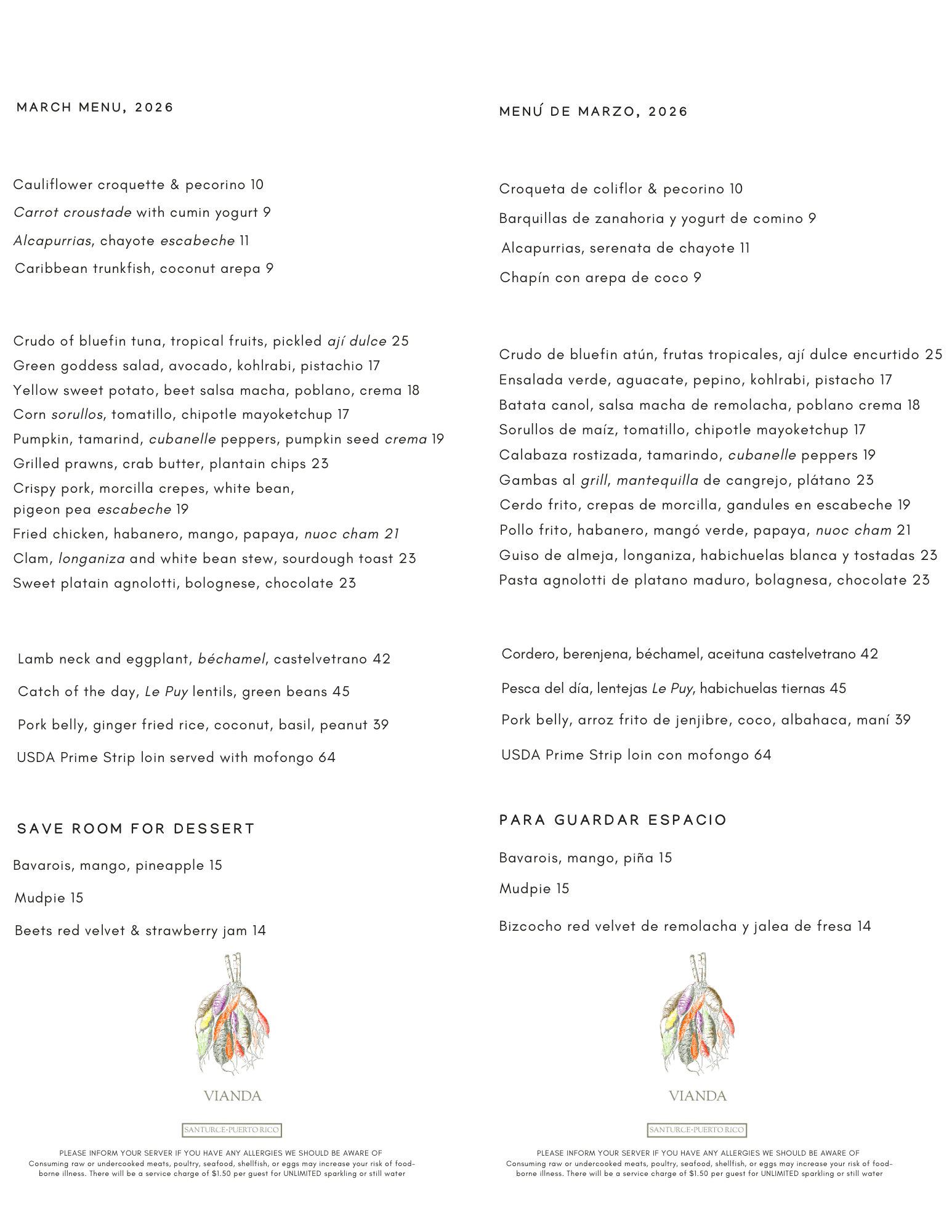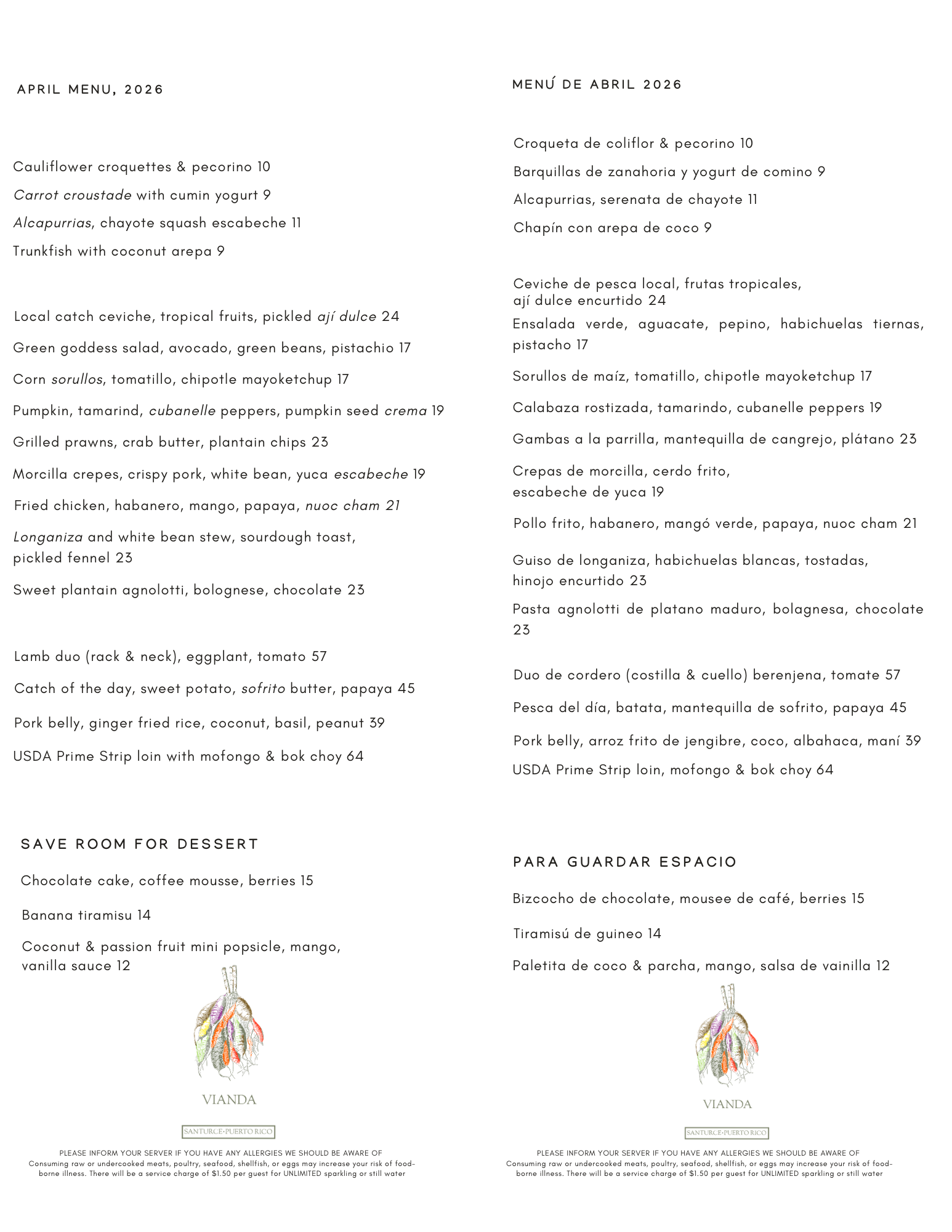 In 2017 they moved to San Juan, Chef Guzmán's hometown, to start building their first restaurant: Vianda. The Spanish language adopted the word "vianda" from the latin word “vivanda,” which means a place of living. Vianda serves a small, constantly evolving, farm-to-table menu anchored by local ingredients and products. This enables us to create, fresh, delicious food focusing on the best that Puerto Rico has to offer: its agriculture and its warm hospitality.