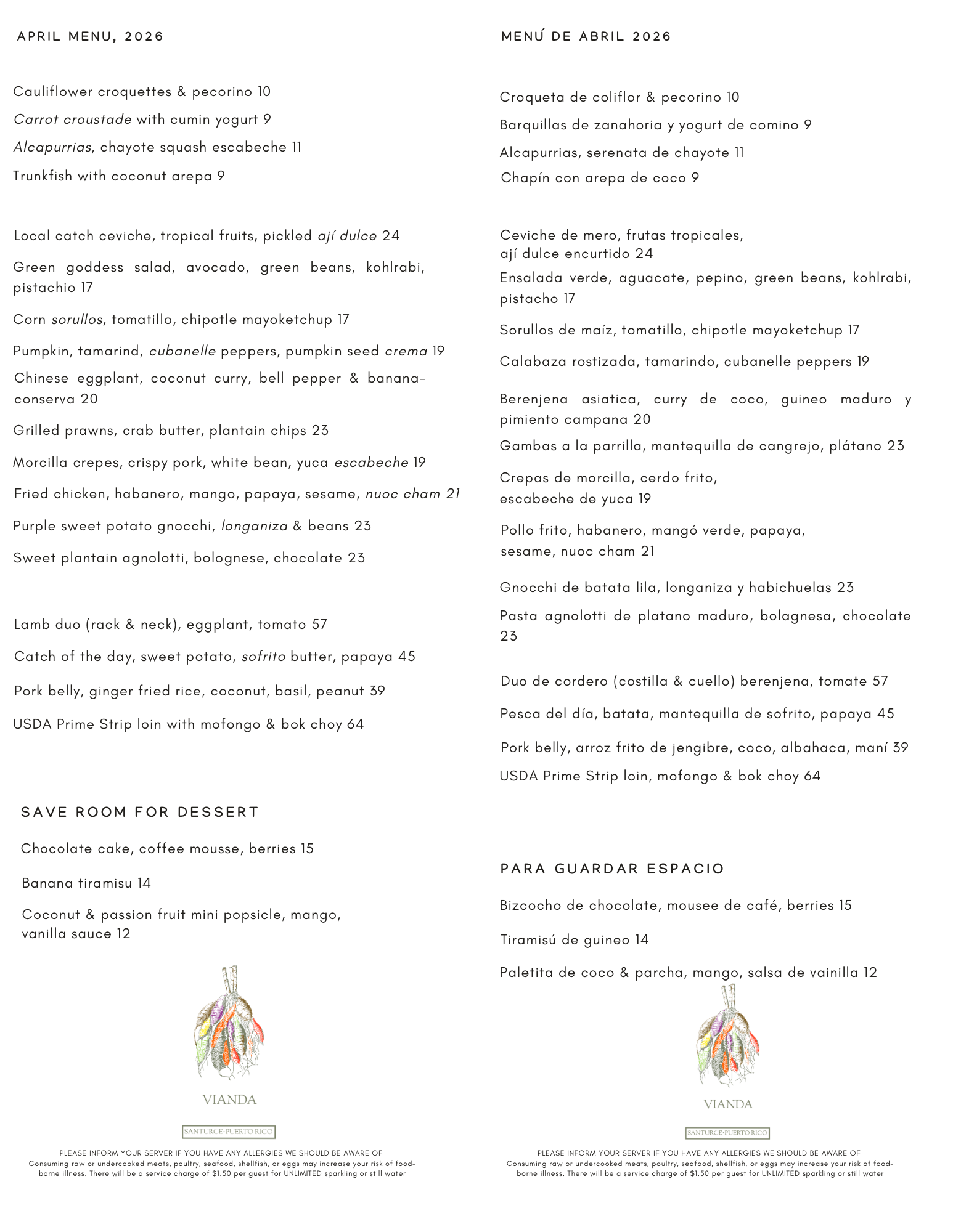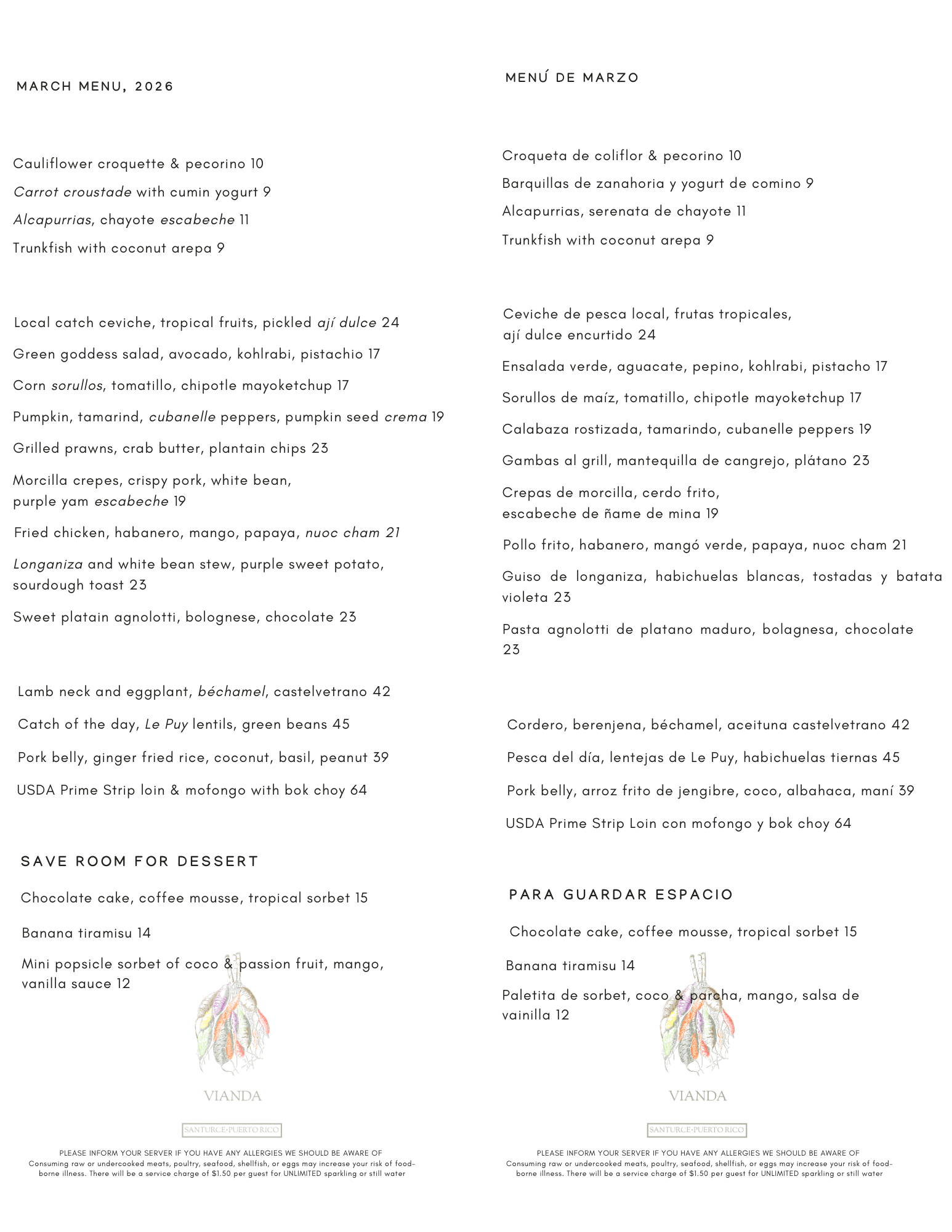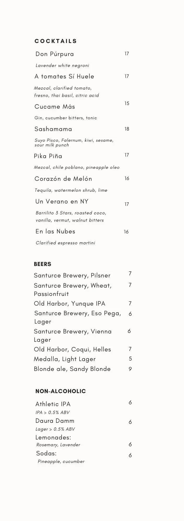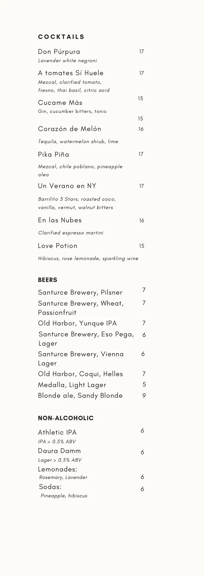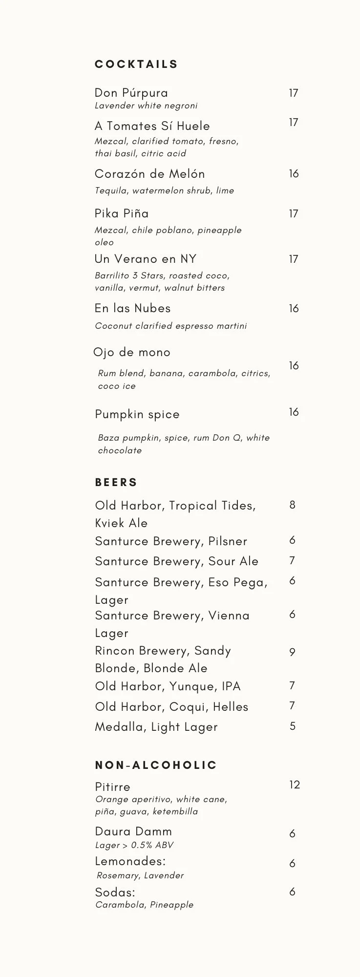 In 2017 they moved to San Juan, Chef Guzmán's hometown, to start building their first restaurant: Vianda. The Spanish language adopted the word "vianda" from the latin word “vivanda,” which means a place of living. Vianda serves a small, constantly evolving, farm-to-table menu anchored by local ingredients and products. This enables us to create, fresh, delicious food focusing on the best that Puerto Rico has to offer: its agriculture and its warm hospitality.